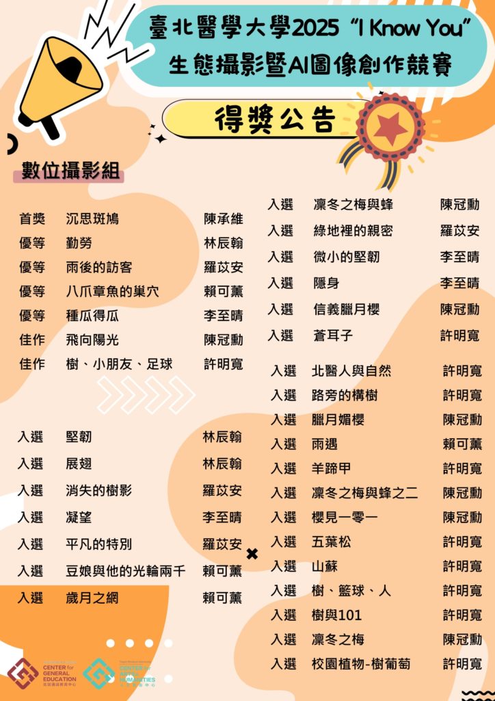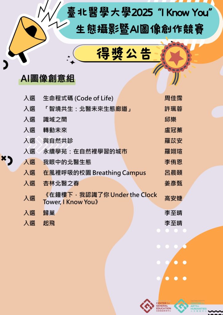 <獲獎公告>【臺北醫學大學I Know You生態攝影與AI圖像創意競賽】 Posted by tmu Categories 一般公告, 競賽公告 Date 2025 年 12 月 2 日 📢<獲獎公告>【臺北醫學大學I Know You生態攝影與AI圖像創意競賽】 2025 I Know You──生態攝影與AI圖像創意競賽得獎名單公布! 我們看見了你們的視角、創意與心意。 這一次,你們不只「懂」自然,也讓自然「被理解」。 你們用鏡頭與AI說的故事—— 是對自然界最溫柔、最深刻的理解。 恭喜所有得獎者, 也感謝每一位參與者與我們一起完成「I Know You」的意義。 公開頒獎:12月09日(星期二)12:10-13:00 地點:杏春樓1樓i10策展區 頒獎項目:首獎、優等、佳作 tmu Previous post <競賽公告>【臺北醫學大學I Know You生態攝影與AI圖像創意競賽】 2025 年 12 月 2 日